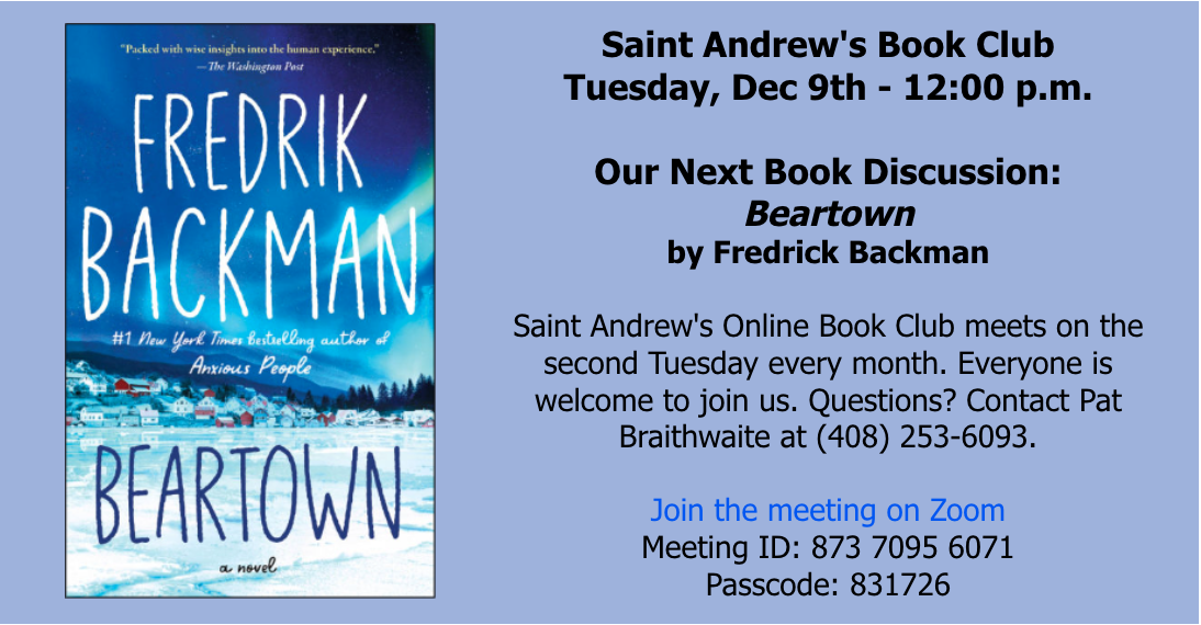 Saint Andrew's Book Club meets online the 2nd Tuesday every month. Everyone is welcome to join us. Questions? Contact Pat...